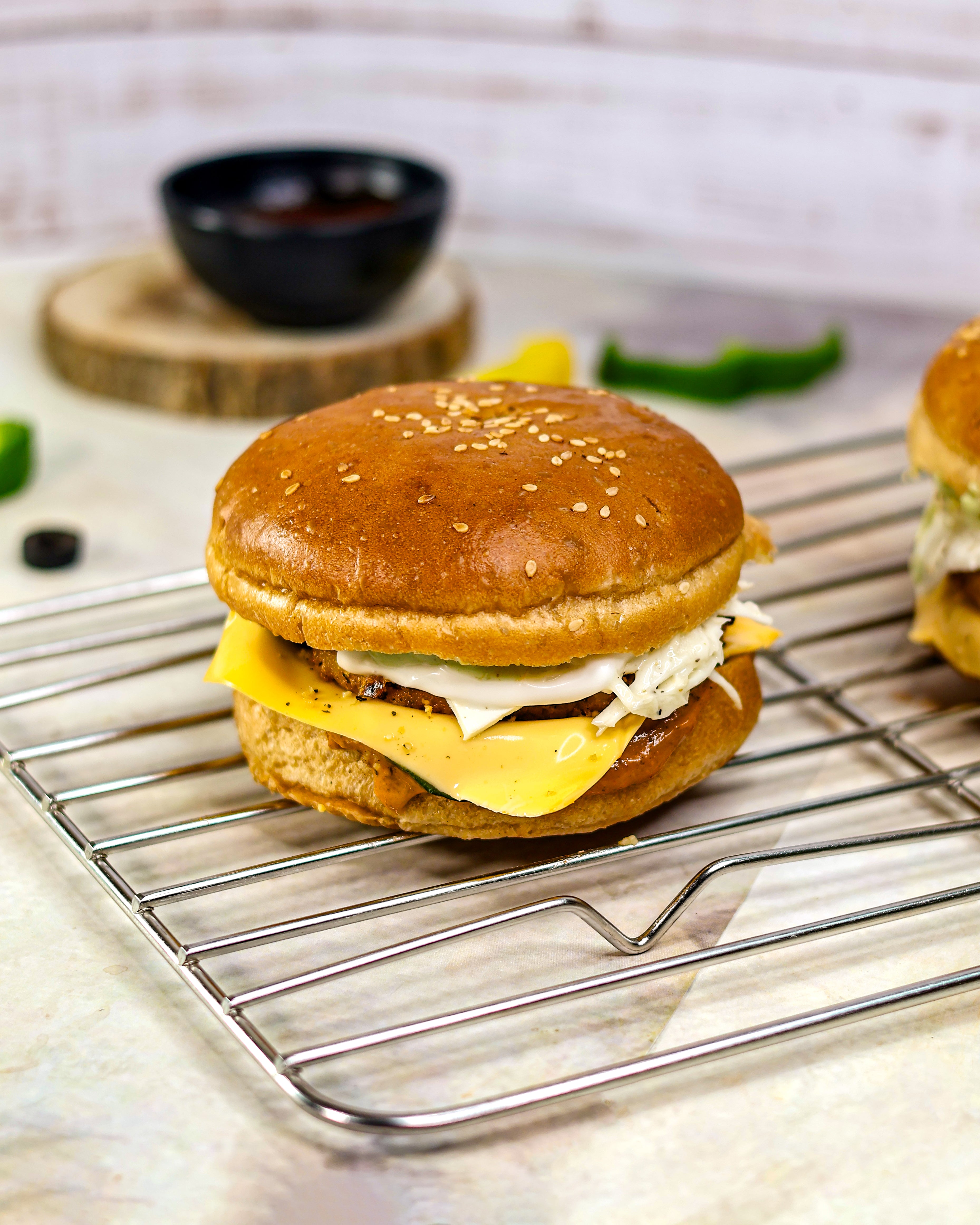 A crispy aloo tikki layered with fresh vegetables, melted cheese, and tangy sauces, all sandwiched between a soft, toasted bun. A flavorful vegetarian delight!