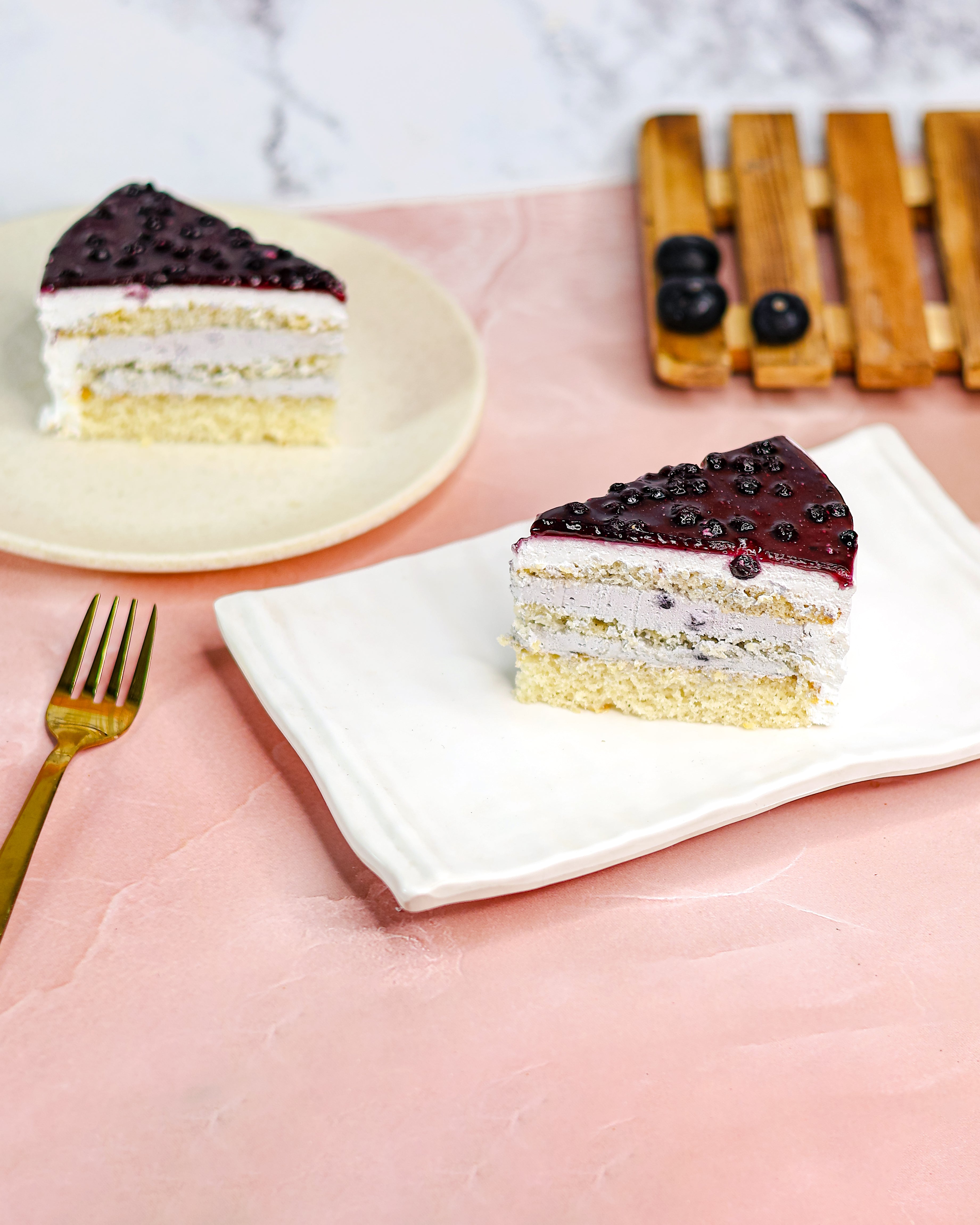 A soft, fluffy vanilla sponge layered with juicy blueberry filling. This delightful pastry is finished with a generous topping of vibrant blueberry compote, adding a burst of fruity sweetness.