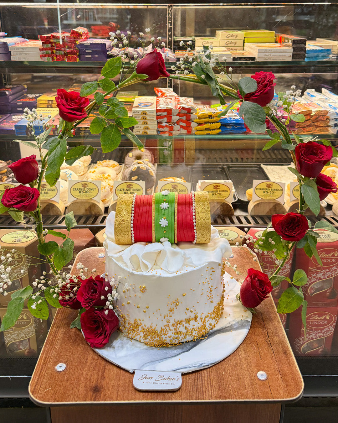 Celebrate the beauty of Punjabi traditions with our Bridal Bangle Cake, specially crafted for bangle ceremonies and pre-wedding rituals. Designed with handcrafted edible chooda bangles, elegant white draping, and fresh roses, this cake brings a touch of luxury and culture to the bride’s special day.