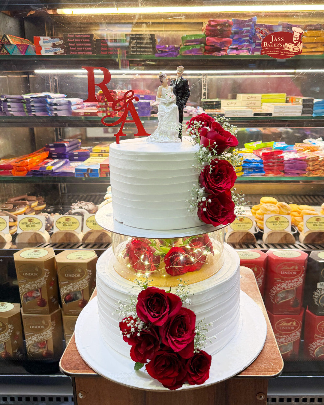 Celebrate love in its most timeless form with our Classic Red Rose Wedding Tier Cake. Designed with three elegant tiers, this cake features smooth white textures, fresh red roses, baby’s breath accents, and a stunning transparent middle tier decorated with glowing fairy lights and roses.