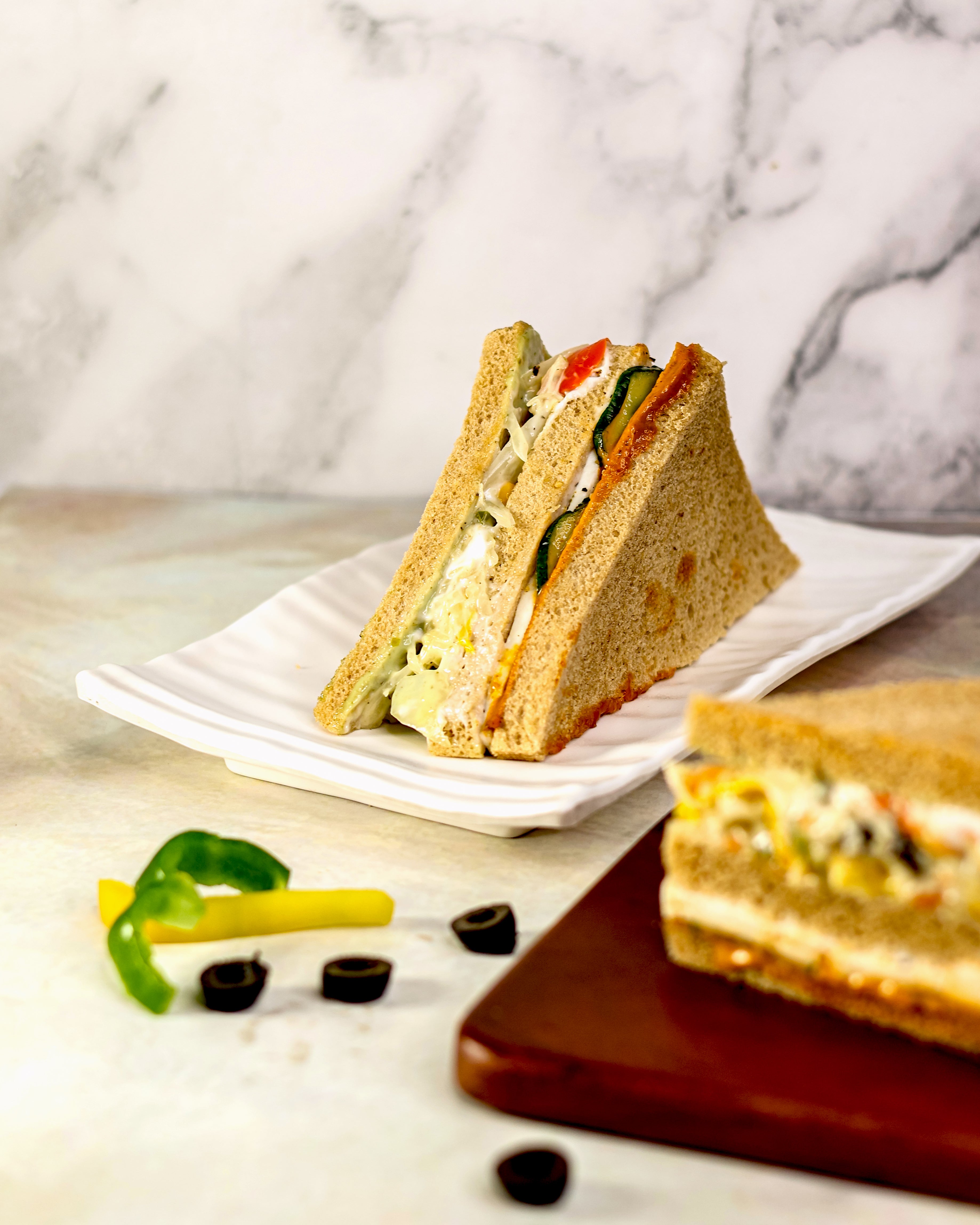 A delicious triple-layer eggless club sandwich filled with soft, spiced paneer, fresh lettuce, juicy tomatoes, crunchy cucumbers, and creamy mayo, all stacked between perfectly toasted bread.