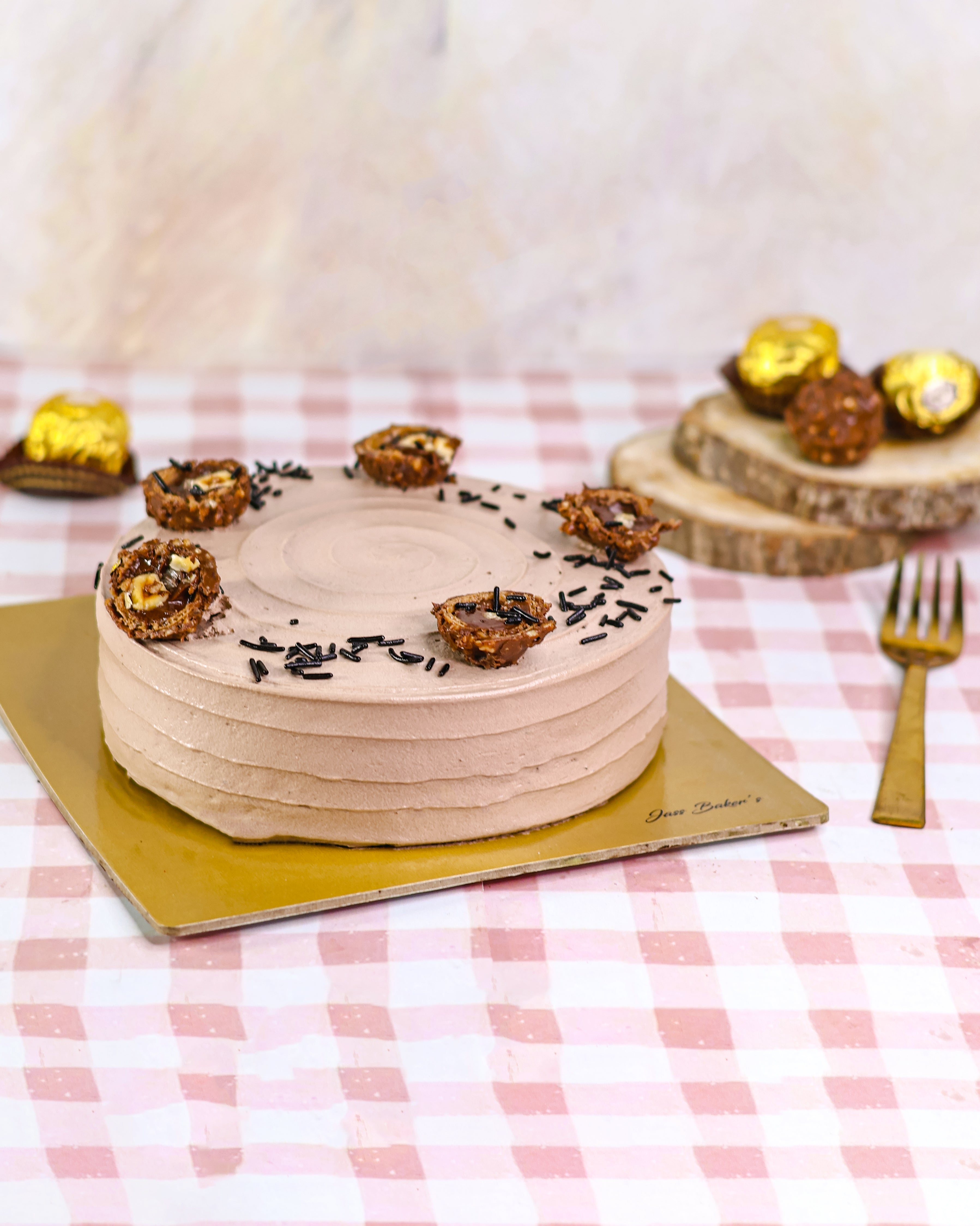 This irresistible cake features moist chocolate layers filled with silky truffle cream and pieces of real Ferrero Rocher chocolates inside, adding a delightful blend of crunch, creaminess, and hazelnut richness.