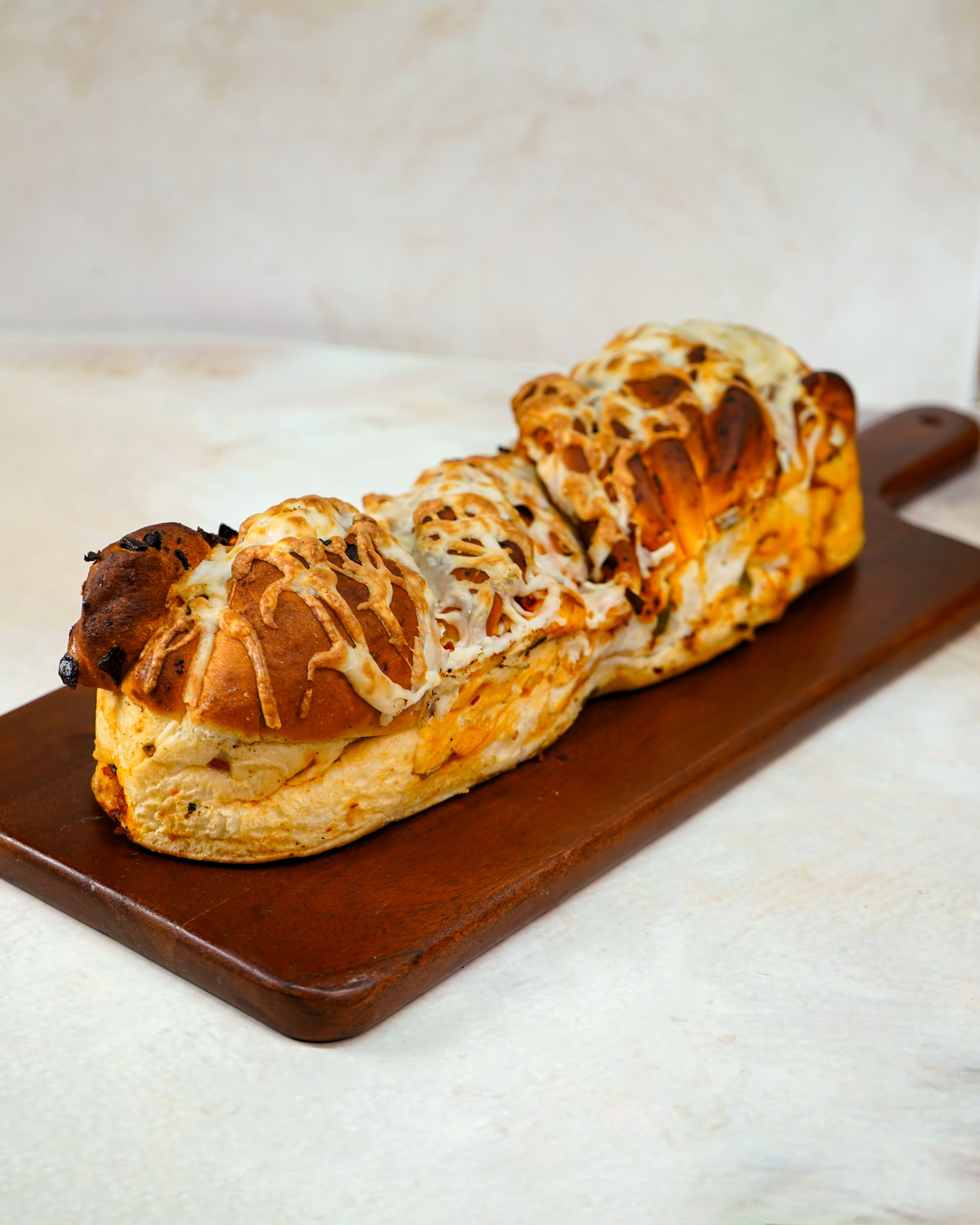 Soft, freshly baked pizza tie bread loaded with classic pizza toppings, melted cheese, and a sprinkle of chili flakes for a mild spicy kick.