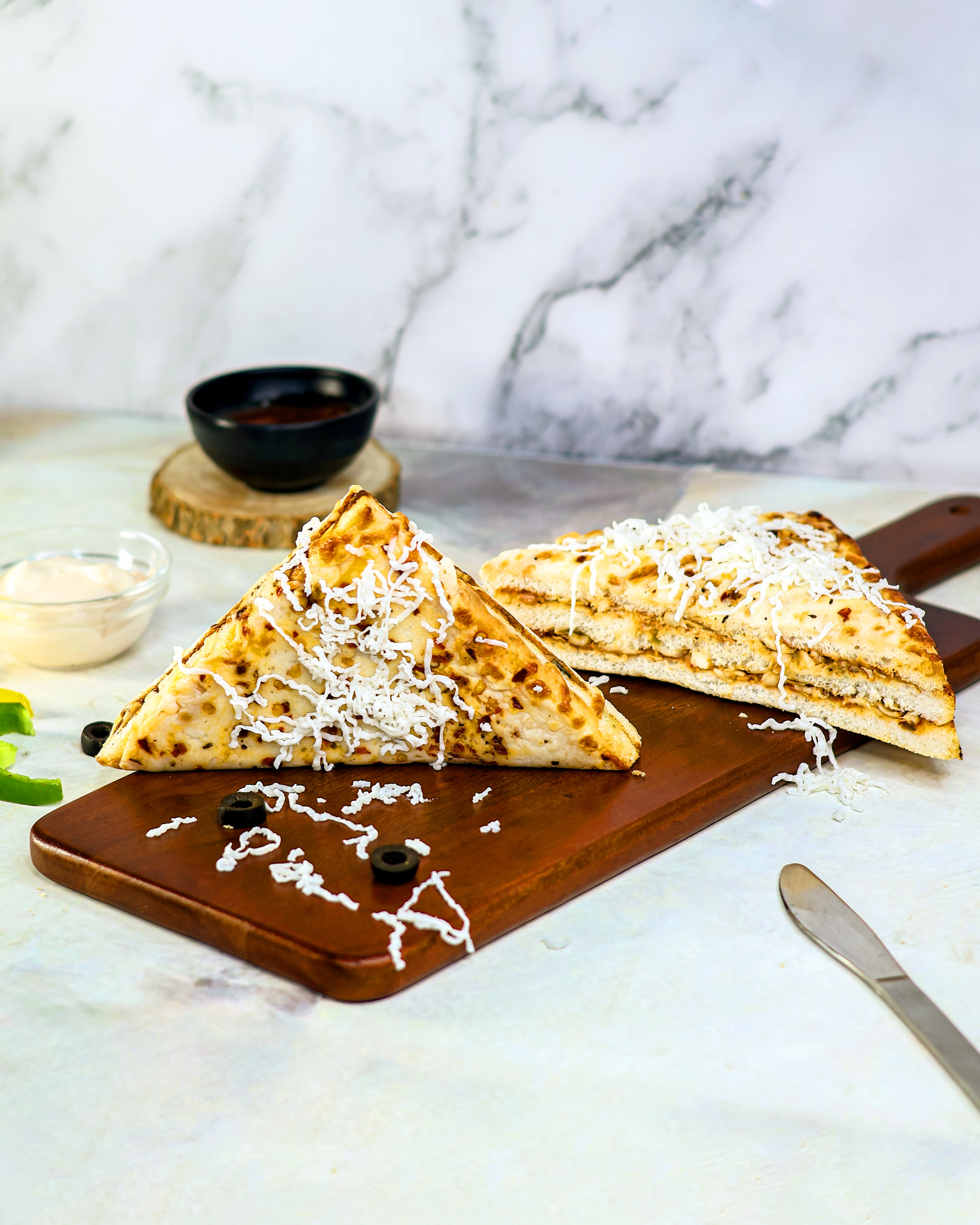 A delicious fusion of pizza flavors and sandwich comfort—filled with melted cheese, rich pizza sauce, and fresh veggies, all toasted to perfection.