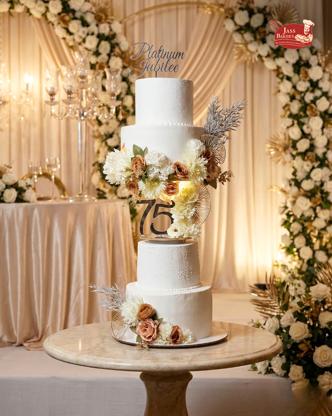 A luxurious multi-tiered platinum jubilee cake crafted in a timeless ivory finish, highlighted with delicate floral arrangements in soft peach, cream, and gold accents. The elegant floating “75” centerpiece and refined textures create a graceful, celebratory statement—perfect for honoring a milestone anniversary with sophistication and charm.