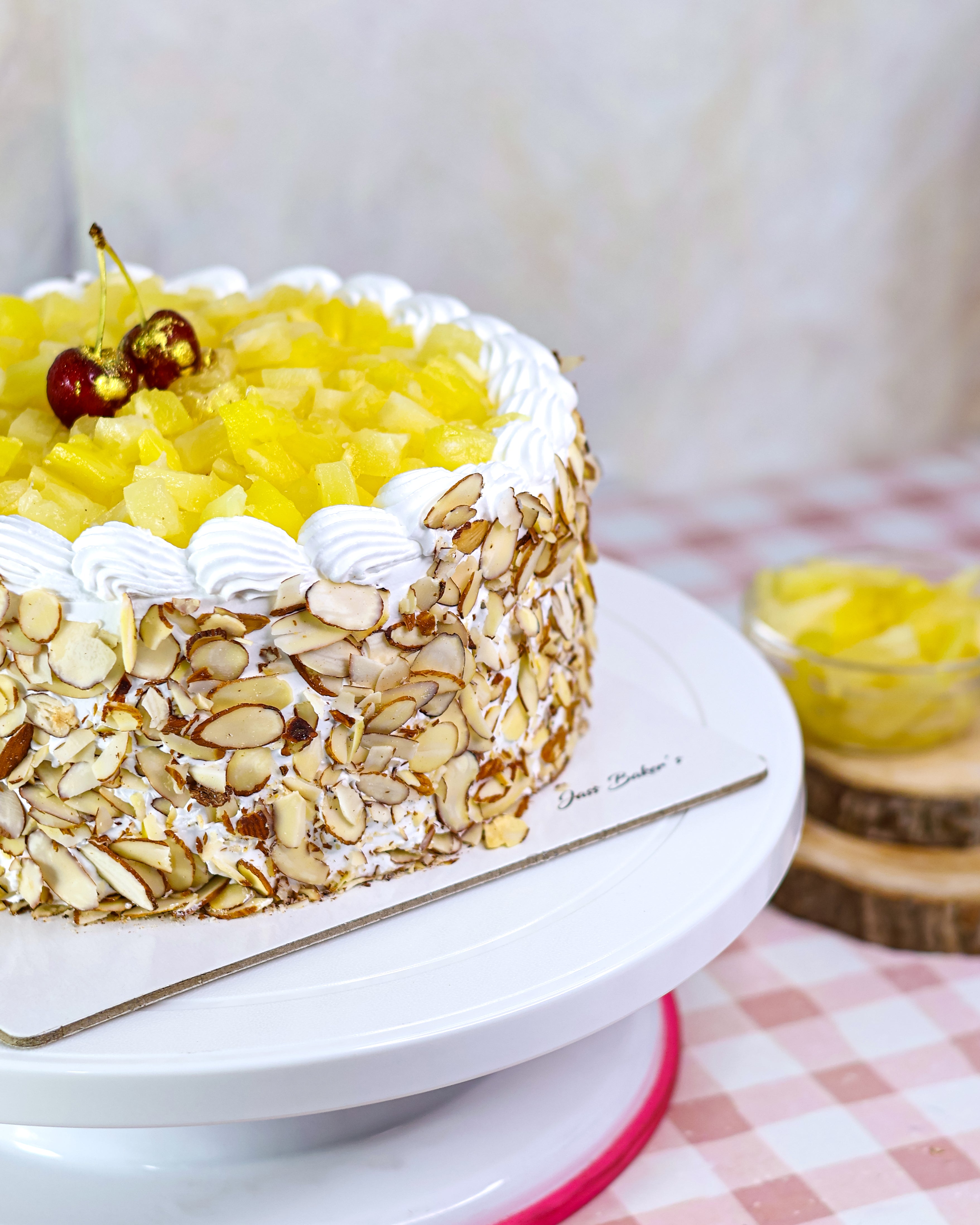 This light and refreshing cake features layers of fluffy vanilla sponge generously filled with juicy pineapple chunks, creating a delightful combination of sweet and tangy flavors in every bite