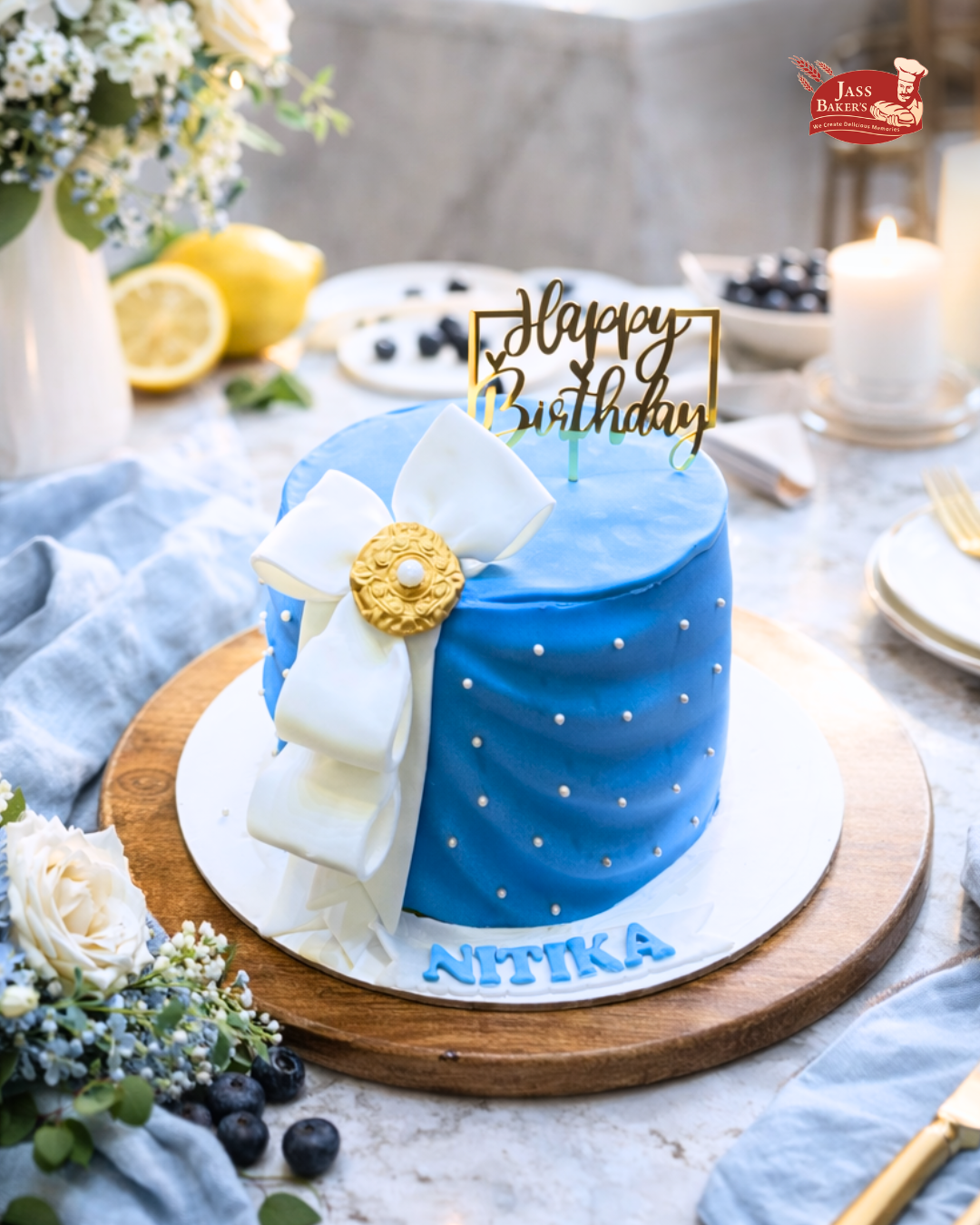Make birthdays extra special with this elegant royal blue cake, beautifully wrapped in a smooth fondant finish. Adorned with delicate pearl detailing and a luxurious white bow featuring a golden brooch centerpiece, this cake is the perfect blend of grace and celebration. Topped with a stylish “Happy Birthday” charm and customized with your loved one’s name, it’s designed to turn moments into memories.