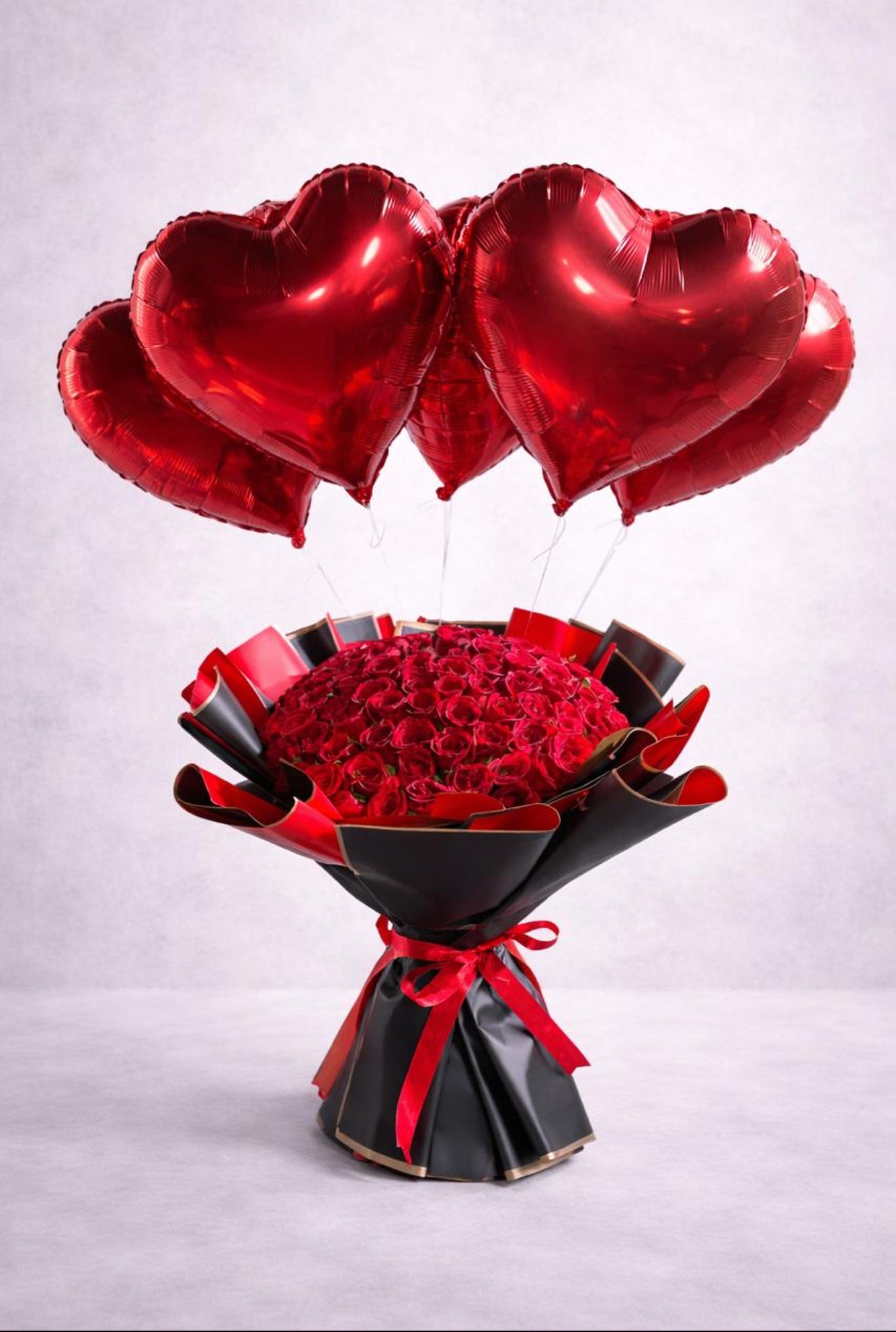 Make an unforgettable statement with our most sculptural arrangement yet. This masterpiece features a dense, hand-tied dome of 100 premium fresh red roses, meticulously staged within a tiered architectural wrap of midnight black and crimson. Crowned with a floating canopy of six metallic heart balloons, this bouquet is designed for grand proposals, milestone anniversaries, or when only the most extraordinary gesture will do.